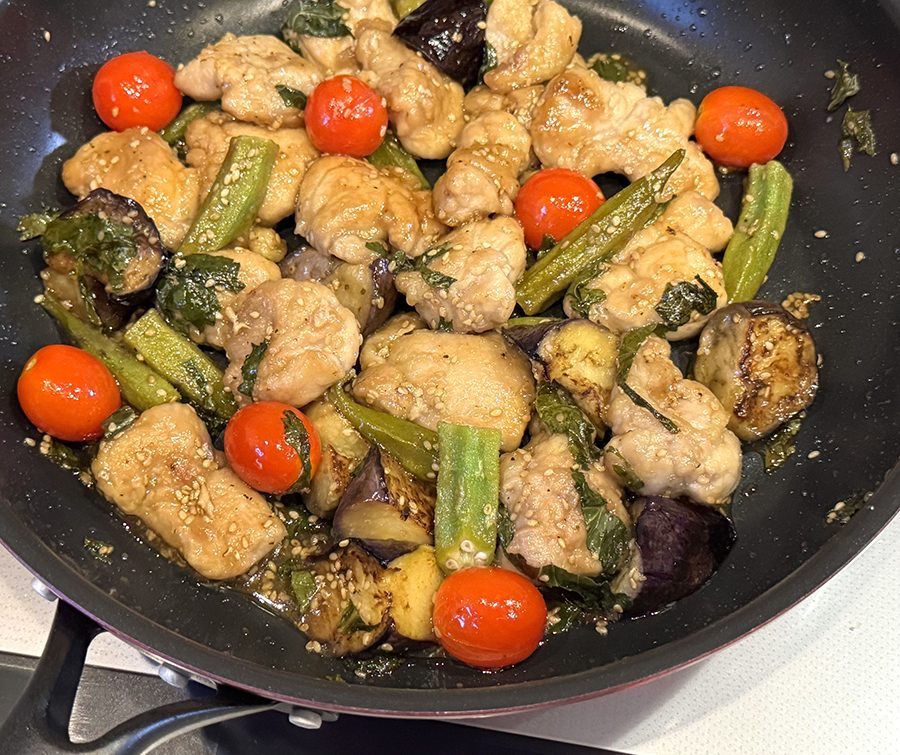 鶏ももとナスをフライパンに。