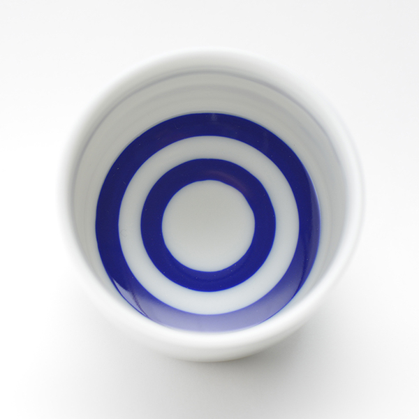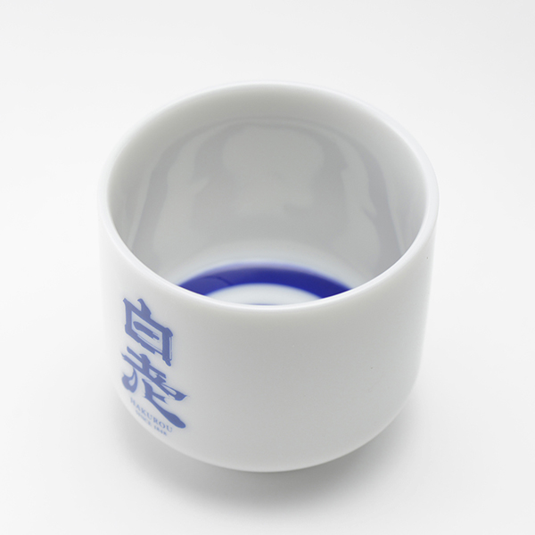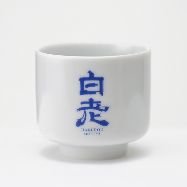 今白老のロゴが入った磁器製お猪口。2.5勺サイズで直径約5センチ、高さ4.8センチくらいです。