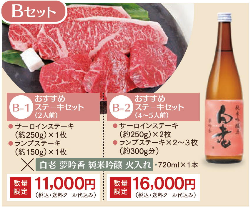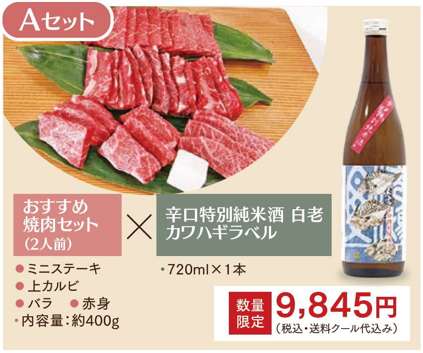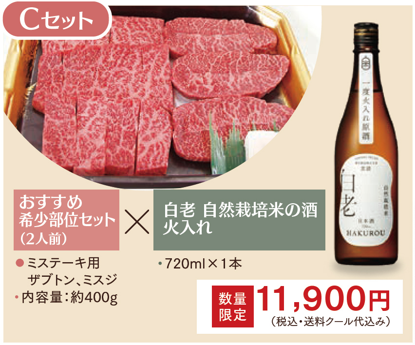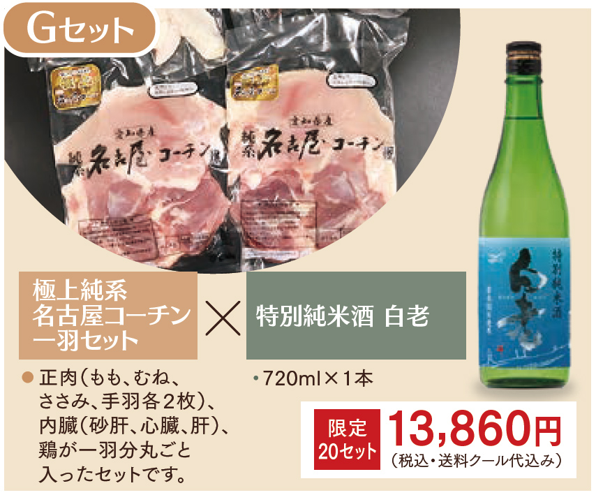 酒粕を食べて育った牛、豚、名古屋コーチンと、白老のお酒を堪能する年2回期間限定のセットをお届けします。
