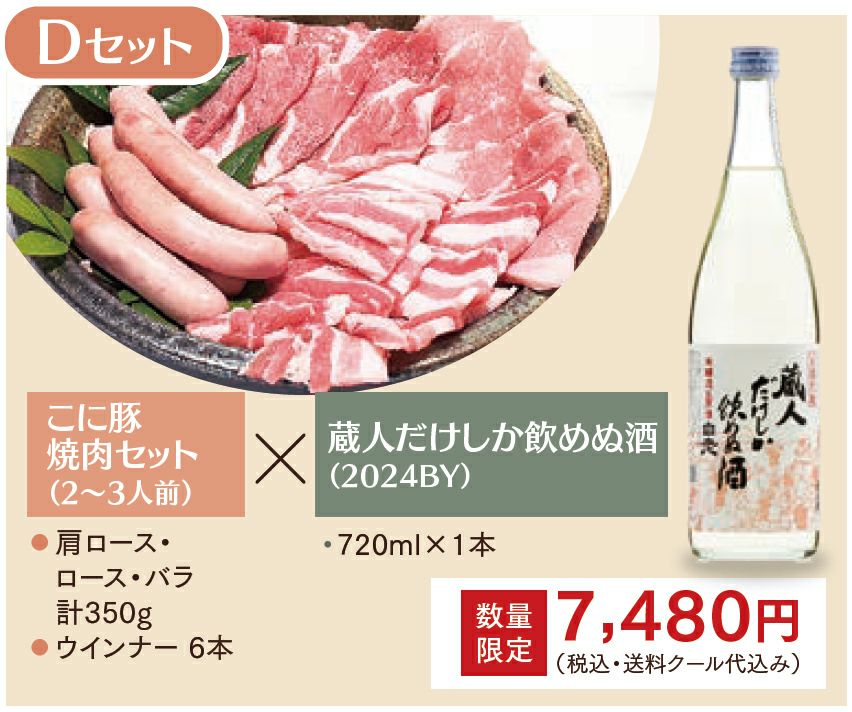 他の画像を見る 【Dセット】こにし養豚さんのこに豚焼肉セット(2~3人前)×蔵人だけしか飲めぬ酒(720ml) 予約商品 予約販売価格 ¥ 7,480 税込 こちらは予約商品です 予約受付期間 2025/11/17 0:00 〜 2025/12/12 23:59 お肉の旨み甘みがどっしりとしたお酒とぴったり合う焼き肉ペアリングセットです。 カートに入れる お気に入りに登録する