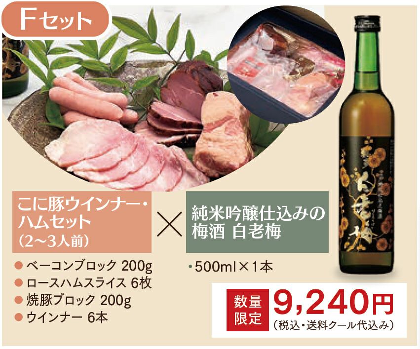 他の画像を見る 【Fセット】こにし養豚さんのこに豚ウインナー・ハムセット(2~3人前)×純米吟醸仕込みの梅酒 白老梅(500ml) 予約商品 予約販売価格 ¥ 9,240 税込 こちらは予約商品です 予約受付期間 2025/11/17 0:00 〜 2025/12/12 23:59 贈答にもおすすめの加工商品のセット。爽やかな白老梅のおつまみにぴったりです。 カートに入れる お気に入りに登録する