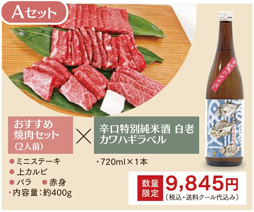 他の画像を見る 【Aセット】知多牛工房 牛小屋さんのおすすめ焼肉セット(2人前)×辛口特別純米酒 白老 カワハギラベル(720ml) 予約商品 予約販売価格 ¥ 9,845 税込 こちらは予約商品です 予約受付期間 2025/11/17 0:00 〜 2025/12/12 23:59 柔らかく脂の乗ったお肉と、辛口で酸のきいたお酒がぴったり合うセットです。 カートに入れる お気に入りに登録する
