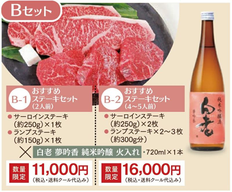 【B-1セット】知多牛工房 牛小屋さんのおすすめステーキセット(2人前)×白老 夢吟香 純米吟醸 火入れ(720ml)