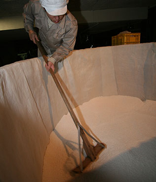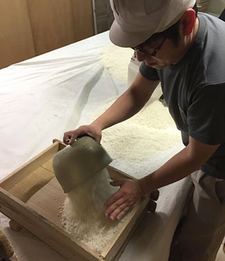 蒸米に麹菌を繁殖させたもので、酒づくり工程中最も重要な作業です。