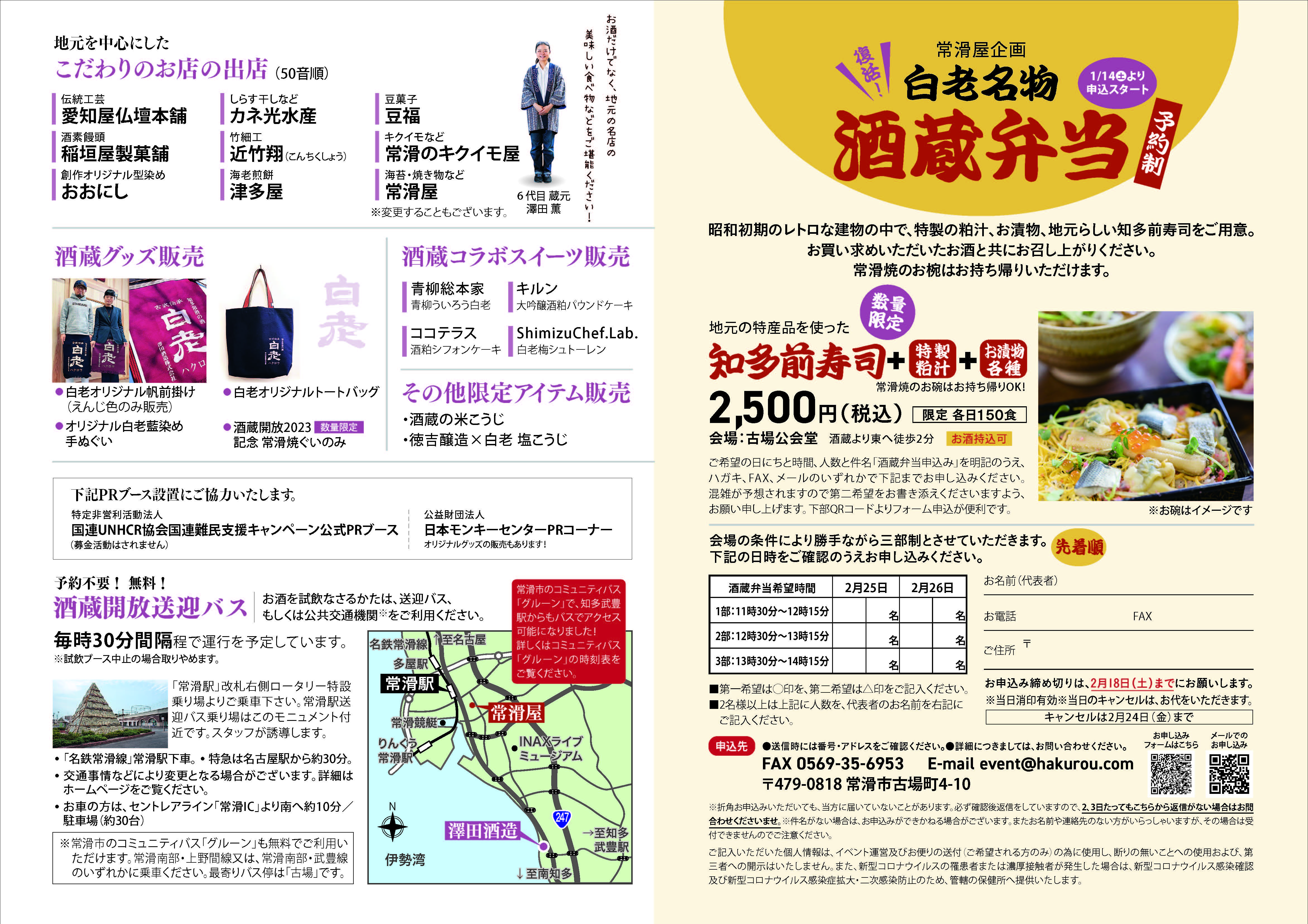 | 場所 | 澤田酒造㈱ 愛知県常滑市古場町4-10 TEL0569-35-4003 (常滑駅より無料シャトルバス送迎あり アクセスは下記に掲載) |